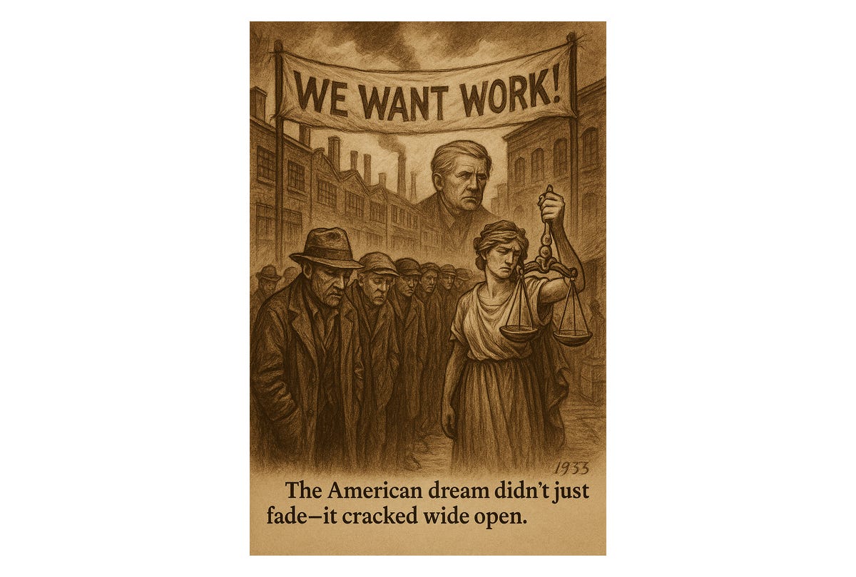 Then came the crash of 1929. The Great Depression brought breadlines, Hoovervilles, and shattered illusions of prosperity. One in four Americans was out of work. Thousands of banks failed. Tent cities rose. The capitalist promise felt broken.
